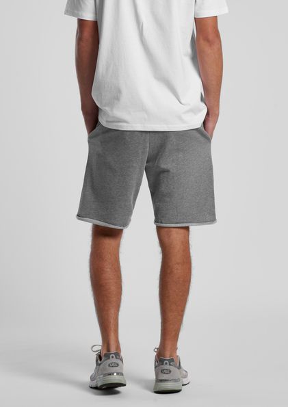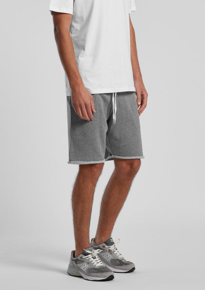 Sweat shorts, 2 side and 1 back pocket, raw edges, elastic waistband, white external drawcord, stitching detail around pockets, preshrunk to minimise shrinkage