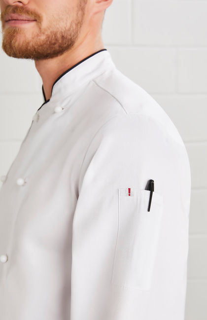 Sizes: XS 4XL; Fabric: 65% Polyester, 35% Cotton twill,220 GSM,UPF Rating: 50+; Features: Traditional double-breasted front,Full length sleeve with turn back cuffs,Mandarin collar with apron tab to hold apron in place,2 Sleeve thermometer/pen pockets,Matching plastic stud buttons,Long length with side splits for ease;