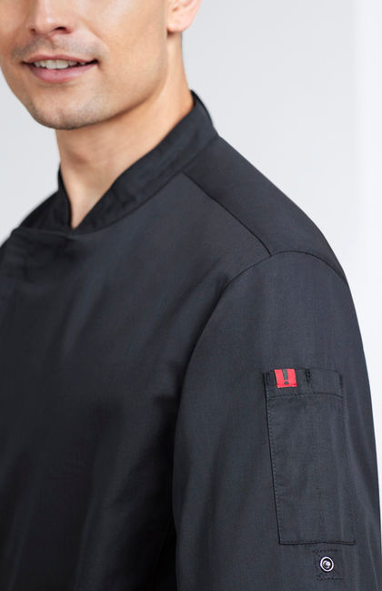 Sizes: XS 4XL; Extras: ; Fabric: 65% Certified Recycled PET Polyester, 35% Cotton Twill,160 GSM,UPF Rating: 50+; Features: This garment has been made using recycled polyester resulting in the equivalent of up to 18 plastic bottles being diverted from landfill.,Concealed zip front closure delivers a clean minimalist look.,Lightweight twill cloth with underarm mesh ventilation keeps you cool where you need it most.,Mandarin collar with apron tab to hold apron in place.,2 Sleeve thermometer/pen pockets.,Long sleeve with side splits for ease.,Long sleeve style features roll-up sleeve function with inside tab and button.;
