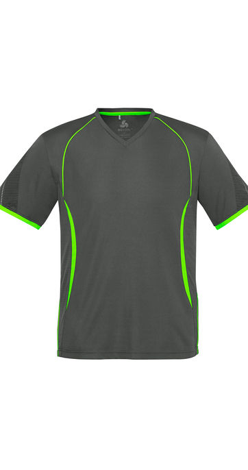 Sizes: S - 3XL, 5XL; Extras: ; Fabric: 100% BIZ COOL Polyester Sports Interlock,155 GSM,UPF rating - Excellent; Features: Grid mesh underarm panels for breathability,Unique sleeve print feature,Contrast panels and piping,Self-fabric V-Neck binding;