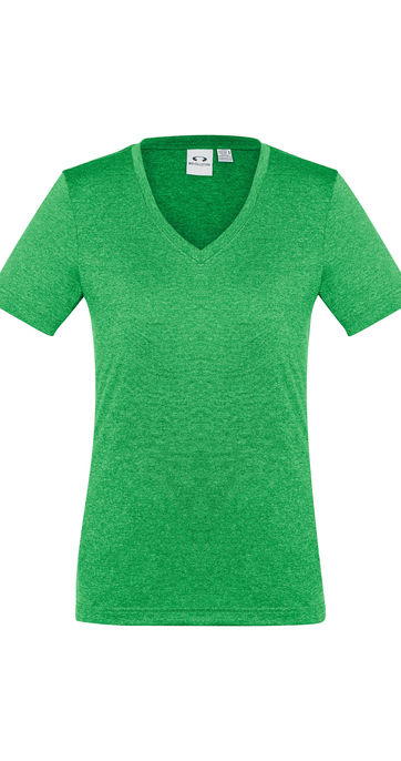 Sizes: 6 - 24; Extras: ; Fabric: 100% BIZ COOL Cotton-feel Micro Polyester,160 GSM,UPF rating - Good; Features: No-fuss anti-shrink, anti-fade fabric has a soft hand feel that keeps you cool and dry,Heathered marle effect fabric for a modern athletic look,Ladies style features a flattering v-neck;